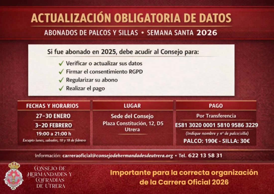 En este contexto, la Comisión Auxiliar del Consejo de Hermandades y Cofradías de Utrera considera oportuno hacer público el calendario previsto para la renovación de los palcos y sillas de la Carrera Oficial, con el objeto de facilitar su conocimiento general y su adecuada difusión. Dicho calendario queda establecido en los siguientes términos: