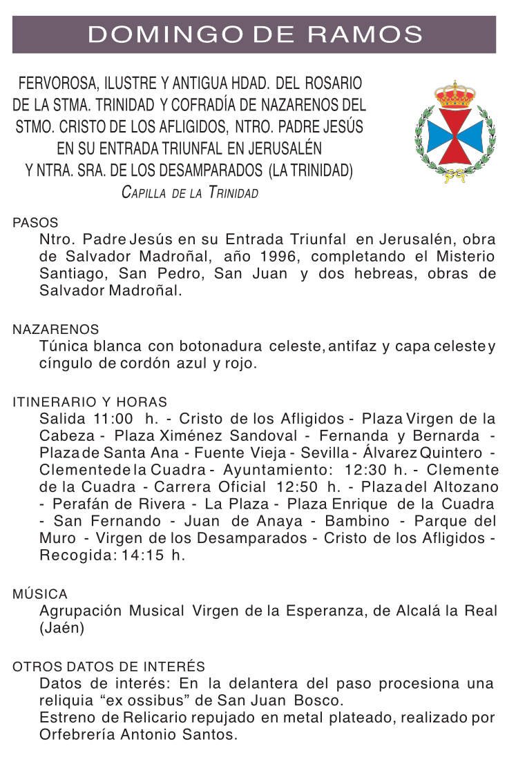Fervorosa, Ilustre y Antigua Hermandad del Rosario de la Santisima Trinidad y Cofradia de Nazarenos del Stmo. Cristo de los Afligidos, Ntro. Padre Jesus en su Entrada en Jerusalen y Ntra. Sra. de los Desamparados.