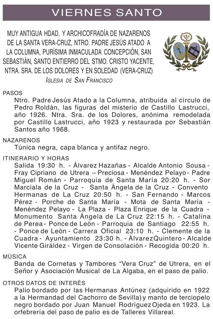 Muy Antigua Hdad. y Archicofradia de Nazarenos de la Santa Vera-Cruz, Ntro Padre Jesus Atado a la Columna, Purisima Inmaculada Concepcion, San Sebastián, Santo Entierro del Stmo. Cristo Yacente, Ntra Sra. de los Dolores y en Soledad (Vera + Cruz)